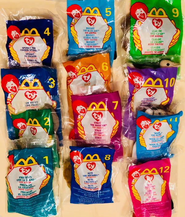 McDonald 1999, A Set of 12 Beanies. Freckles the Leopard, Antsy the Anteater, Smoochy the Frog, Spunky the Cocker Spaniel, Rocket the Bluejay, Iggy the Iguana, Strut the Rooster, Nuts the Squirrel, Claude the Multi-Color Crab, Stretchy the Ostrich, Nook the Husky & Chip the Cat. Still in their plastic envelopes. MINT IN THEIR ORIGINAL PLASTIC POUCH.