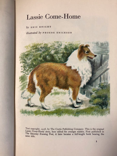 Literature; Children; Short stories Lassie Come Home, The Story of William Tell, Penny and the White House, Rumplestiltskin, The Three Little Pigs, The Poppy Seed Cakes, Peanuts Are Not Nuts, The Sounds We Hear, Rhymes to Learn By, Animals of Africa, Traveling the Underground Railroad, Let's Visit Spain. (156 Pgs.) Includes map of Portugal at rear of book. Illustrated in beautiful color and B/W plates by Phoebe Erickson and Various Artists and Authors. Gray pictorial boards with colors of characters in Aqua with yellow spine. BOOK NEAR VVG.
